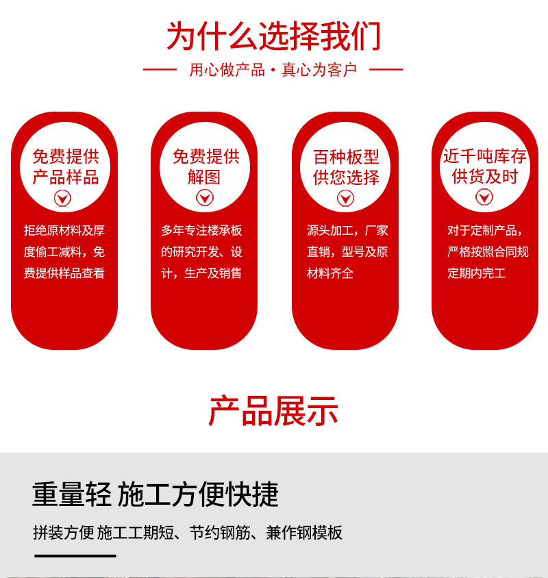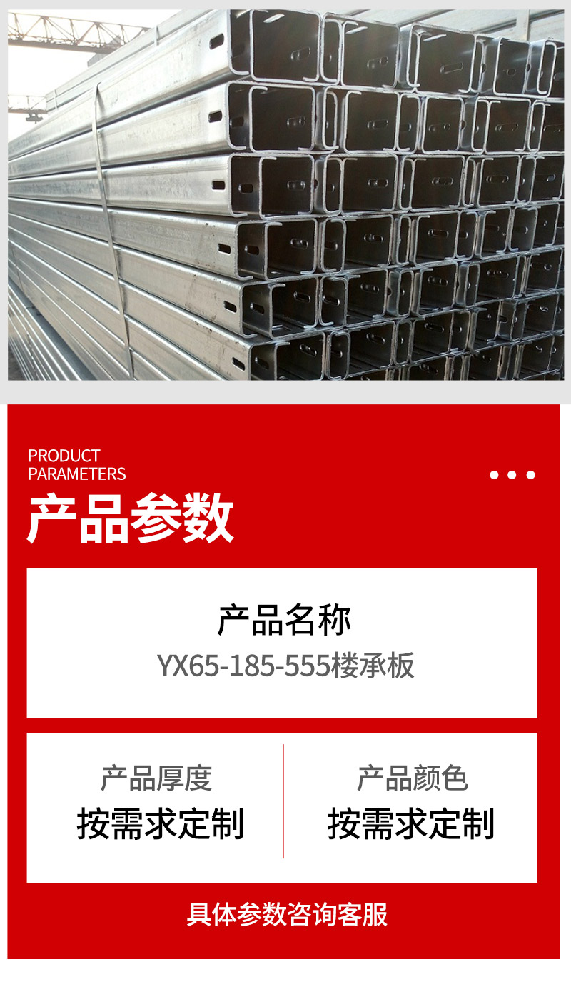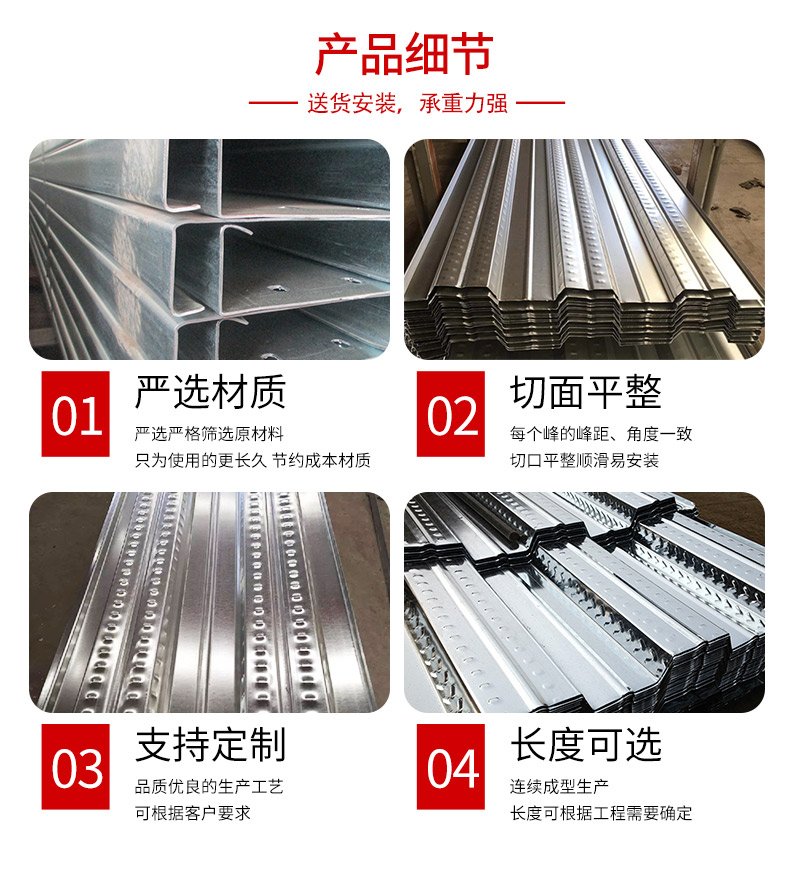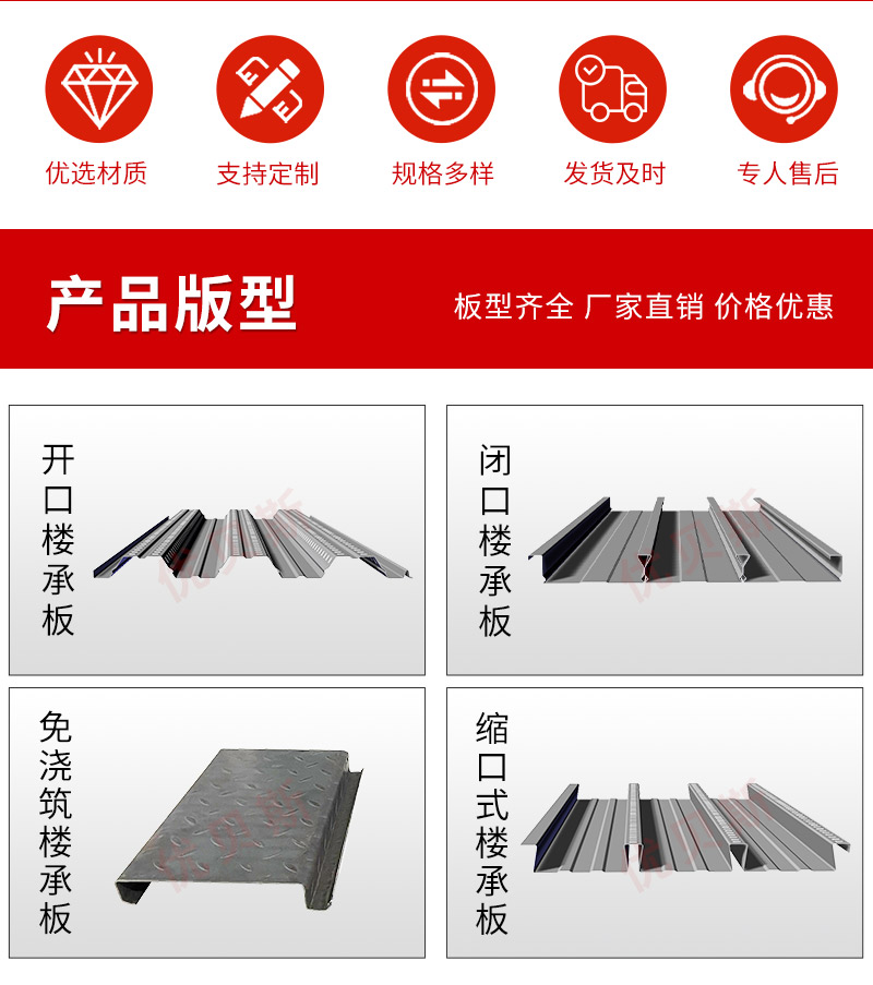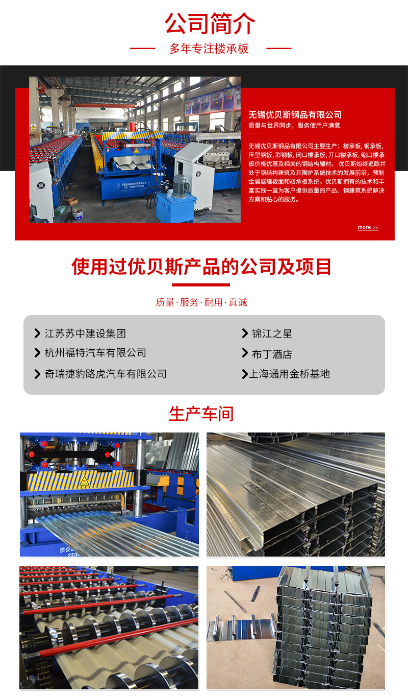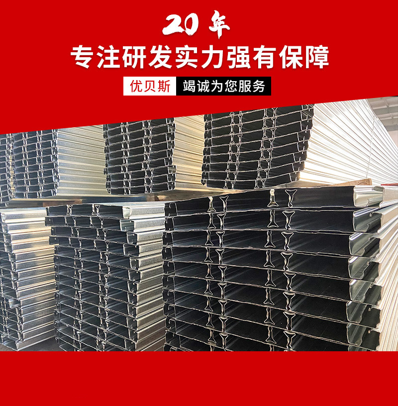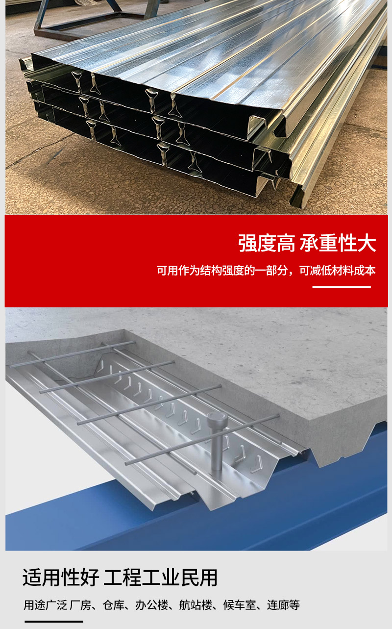 采用鍍鋅鋼板經輥壓冷彎制作成型,施工鋪設后適于澆筑混凝土,與混凝土共同作用聯合形成一個樓面整體,是建筑鋼結構工程中僅次于梁柱的主體部分,用于樓蓋的永久性支撐模板。